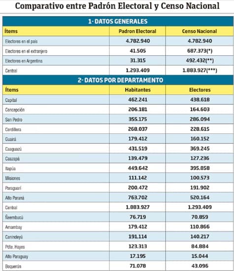 El Departamento Central continúa siendo el más poblado del país, albergando a 1.883.927 personas, de las cuales 1.293.409 están en edad de votar. Estos datos reflejan la importancia de este departamento en el mapa electoral paraguayo.