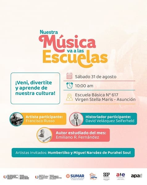 Este sábado 31 de agosto, la Escuela Básica N.º 617 Virgen Stella Maris será el escenario donde niños, niñas, docentes y la comunidad educativa podrán disfrutar de un repertorio selecto de la música paraguaya. El evento contará con la participación del destacado compositor y músico Francisco Russo, conocido como “el juglar del heroísmo paraguayo”, y del historiador David Velázquez Seiferheld, quienes compartirán sus conocimientos y experiencias con los asistentes.