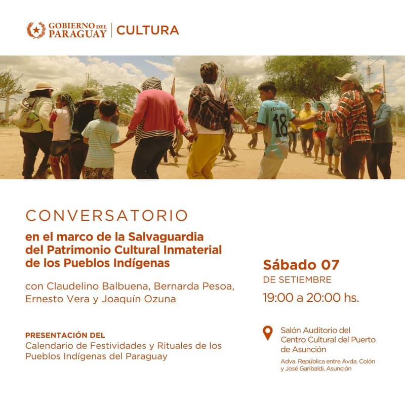 A las 19:00 horas, se realizará un conversatorio sobre la Salvaguarda del Patrimonio Cultural Inmaterial de los Pueblos Indígenas, encabezado por Claudelino Balbuena y líderes religiosos indígenas.