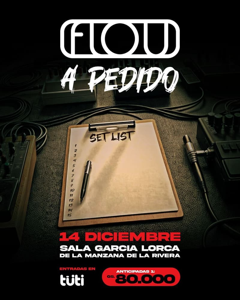 La banda de rock, Flou, anunció un show especial denominado “A Pedido”, que se llevará a cabo el próximo 14 de diciembre en la sala García Lorca de la Manzana de la Rivera, en Asunción. Este evento, que promete cerrar con broche de oro un gran año para la agrupación, tiene una particularidad: serán los propios fans quienes seleccionen las canciones que formarán parte del setlist.