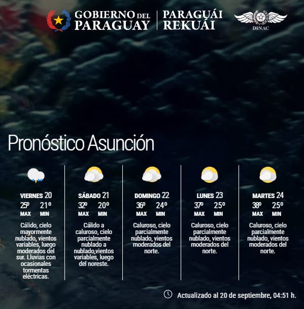 Este viernes se presenta con condiciones climáticas inestables, según el último informe emitido por la Dirección de Meteorología. El pronóstico anuncia lluvias y tormentas eléctricas en gran parte del país, especialmente en el centro y sur de la Región Oriental. Desde la madrugada, un sistema de tormentas ha comenzado a afectar estas zonas y se espera que se extienda a otras áreas a lo largo del día.