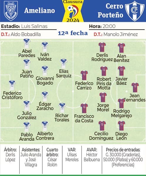 Cerro Porteño se enfrenta hoy a Sportivo Ameliano en un partido crucial por la duodécima fecha del torneo Clausura 2024 del fútbol paraguayo. El encuentro se disputará en el estadio Luis Salinas de la ciudad de Itauguá a partir de las 20:00, bajo el arbitraje de Derlis López y el control del VAR a cargo de Ulises Mereles. El Ciclón, dirigido por Manolo Jiménez, llega con la presión de obtener una victoria para mantener sus aspiraciones en el campeonato.
