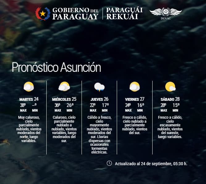 La Dirección de Meteorología ha señalado que el clima se mantendrá en estas condiciones hasta mañana, cuando podrían presentarse algunas lluvias aisladas en el sur del país. No obstante, será el jueves cuando se espera una mayor probabilidad de precipitaciones, que abarcarían gran parte del territorio nacional, incluida Asunción.