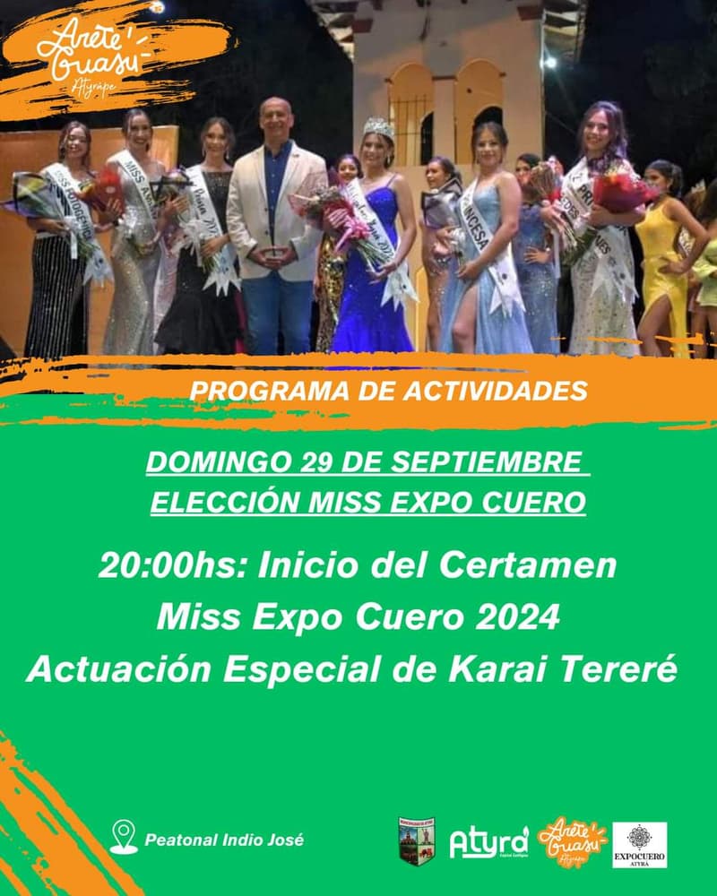 El domingo 29 de septiembre, la Expo Cuero continuará con la elección de la Miss Expo Cuero, uno de los eventos más esperados del Arete Guasu. Además, el grupo Karai Tereré se presentará en la jornada, ofreciendo un show musical que promete deleitar a los asistentes.