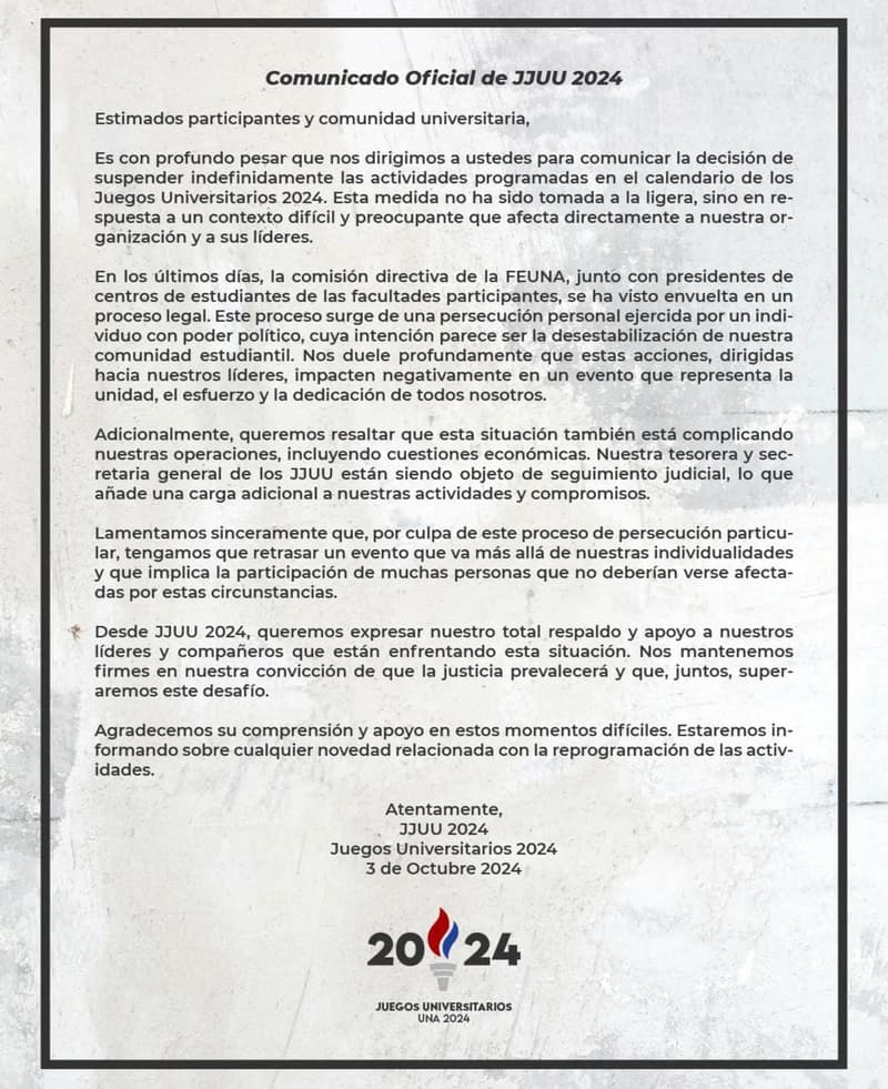 La FE-UNA, que organiza los Juegos Universitarios, informó a través de un comunicado a los delegados de las diferentes unidades académicas sobre la suspensión del evento. La decisión responde a las dificultades operativas y económicas que enfrentan los estudiantes imputados, quienes forman parte del comité organizador de los Juegos.