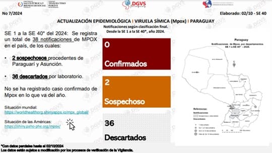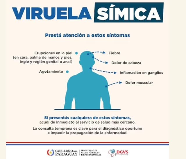 El Ministerio de Salud, a través de su Dirección de Vigilancia de la Salud, emitió un recordatorio a la población sobre los síntomas del Mpox (viruela del mono o viruela símica), tras la aparición de dos casos sospechosos en el país. Los pacientes provienen de las zonas de Paraguarí y Asunción, según el último informe epidemiológico.
