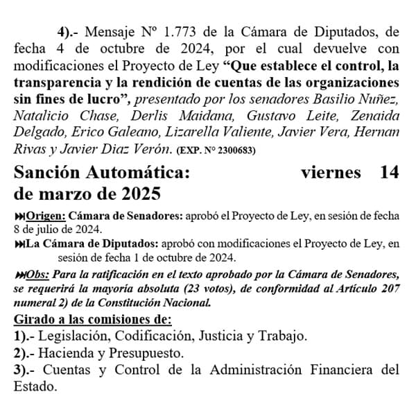El propio Núñez había dicho anteriormente que el Senado se tomaría “el tiempo que sea necesario” para analizar el proyecto, pero ahora parece que las presiones políticas han acelerado el proceso. La inclusión del debate sobre oenegés en el orden del día del miércoles sugiere que la Cámara Alta tiene prisa por resolver el tema.