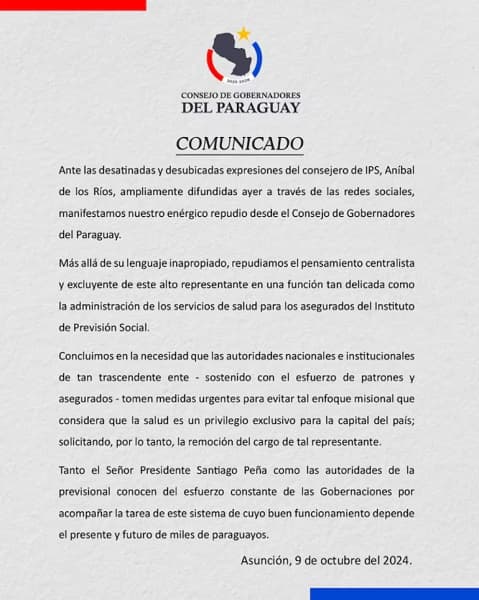 El Consejo de Gobernadores del Paraguay ha manifestado su enérgico repudio a las recientes declaraciones del consejero del Instituto de Previsión Social (IPS), Aníbal de los Ríos. En un comunicado oficial, el consejo, presidido por Cesarito Sosa, gobernador del Guairá, exigió la remoción de De los Ríos tras su polémica recomendación de no gastar dinero en hospitales del interior, sugiriendo que la inversión debería concentrarse en los centros de salud de Asunción, argumentando que estos son más rentables para la imagen de las autoridades.