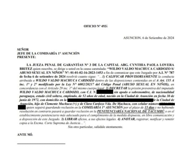 Wildo Valdo Machuca Cardozo, hermano de la jueza Gloria Machuca, ha sido finalmente trasladado a la Penitenciaría de Tacumbú tras estar 40 días detenido en la Comisaría 1ra de Sajonia. Este traslado se dio luego de una denuncia formal por abuso sexual en menores.