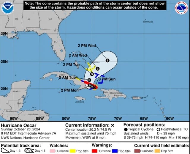 El huracán Oscar, de categoría 1, tocó tierra cerca de Baracoa, en la provincia de Guantánamo, Cuba, a las 5:50 p.m. del domingo, con vientos de 129 km/h. La tormenta llegó acompañada de cortes de energía generalizados en todo el país, afectando especialmente a las zonas más vulnerables. El Centro Nacional de Huracanes de EE.UU. (NHC) emitió una actualización a las 8 p.m. , informando que los vientos se habían debilitado ligeramente, alcanzando los 121 km/h mientras la tormenta avanzaba por el terreno montañoso del este de Cuba.
