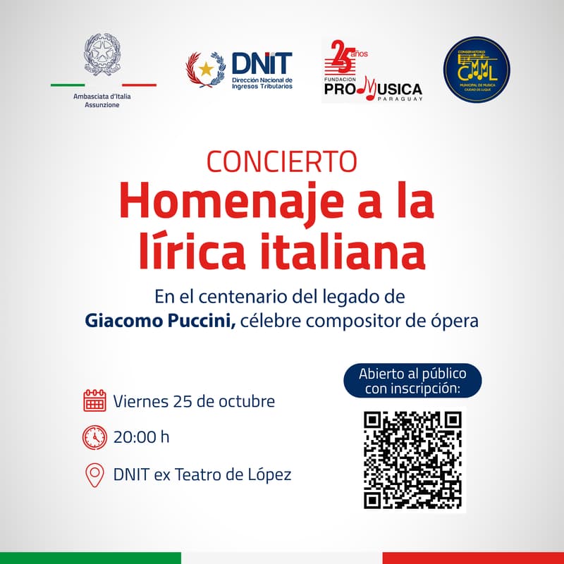 La Embajada de Italia, en conjunto con la Fundación ProMúsica y el Conservatorio Municipal de Música “Ciudad de Luque” (CMMCL), presenta un concierto especial en homenaje a la tradición lírica italiana y al célebre compositor Giacomo Puccini, con motivo de los cien años de su fallecimiento. Este evento se llevará a cabo el viernes 25 de octubre de 2024, a las 20:00 h, en la sede del DNIT (ex Teatro de los López), en Asunción.