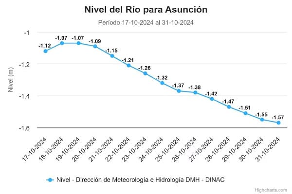 El río Paraguay continúa batiendo récords negativos, con un nuevo descenso de dos centímetros registrado esta mañana en la Estación de Asunción. Según la Agencia Nacional de Navegación y Puertos (ANNP), el nivel del río alcanzó -1,57 metros, estableciendo un nuevo mínimo histórico. Esta cifra refleja una preocupante tendencia que ya suma un descenso total de 10 centímetros en apenas cuatro días.