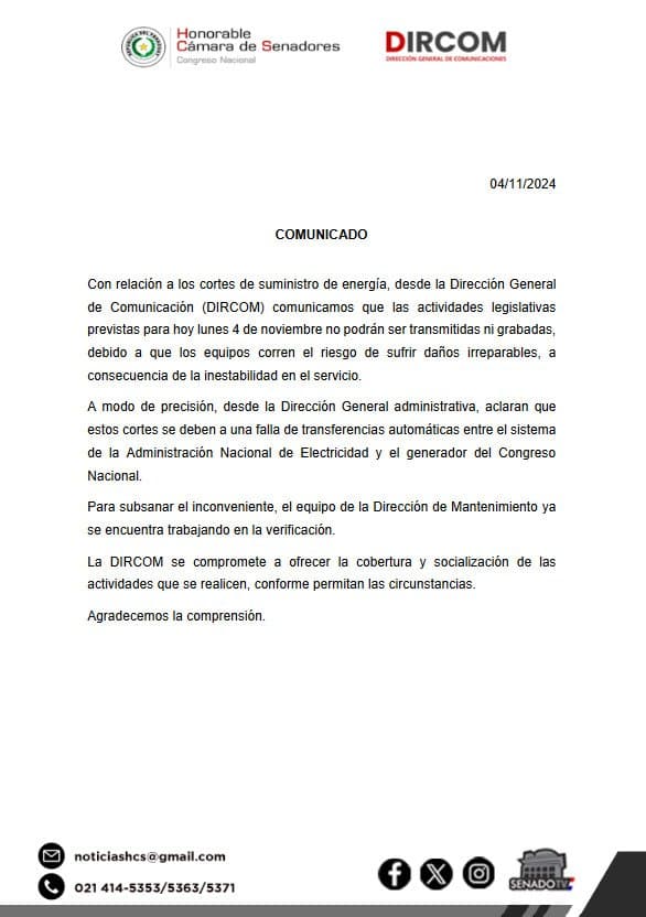 En su comunicado oficial, el Congreso agradeció la comprensión de los afectados y solicitó paciencia mientras los técnicos intentan resolver la falla. La Dirección Administrativa añadió que están gestionando con la ANDE para que el servicio sea restablecido a la brevedad, aunque no especificaron un tiempo exacto para la solución.