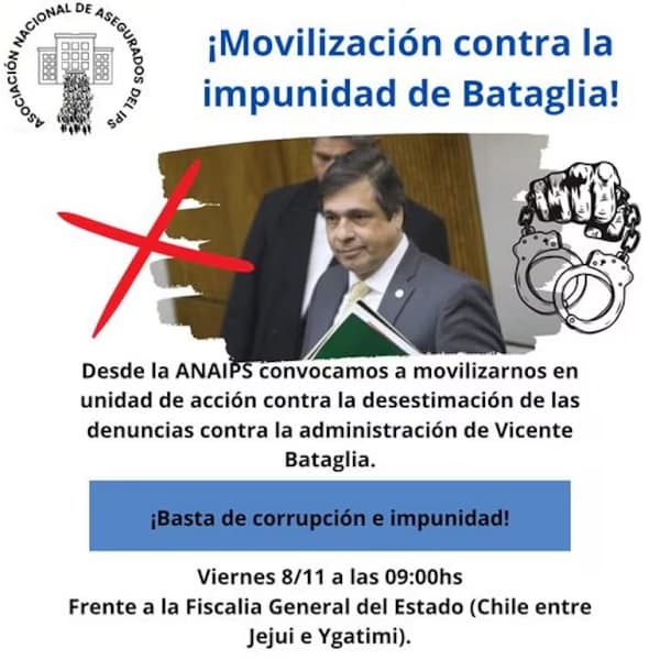 Este viernes 8 de noviembre, trabajadores y jubilados del Instituto de Previsión Social (IPS) se movilizarán en una protesta contra la impunidad y corrupción, en rechazo al pedido de la Fiscalía de desestimar la denuncia contra el expresidente de la institución, Vicente Bataglia. La marcha, organizada por la Asociación Nacional de Asegurados y la Unión Nacional de Jubilados del IPS, se realizará a partir de las 09:00 frente a la Fiscalía General del Estado en Asunción.