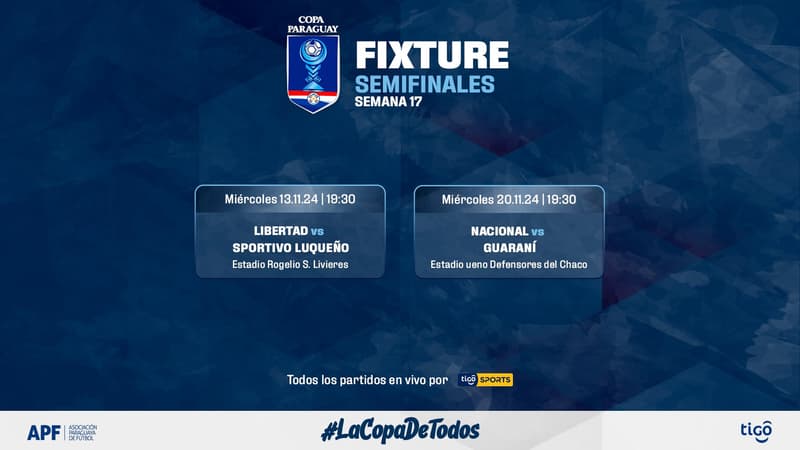 El primer duelo de las semifinales será entre Libertad y Sportivo Luqueño, quienes se enfrentarán el próximo lunes 13 de noviembre en el estadio Rogelio S. Livieres, a partir de las 19:30. Libertad, actual campeón de la Copa Paraguay, aspira a revalidar su título y conseguir el tricampeonato, un logro que consolidaría su posición como uno de los equipos más destacados en el fútbol paraguayo. Por su parte, Luqueño llega a esta instancia con la intención de hacer historia y alcanzar su primera final en la competencia.