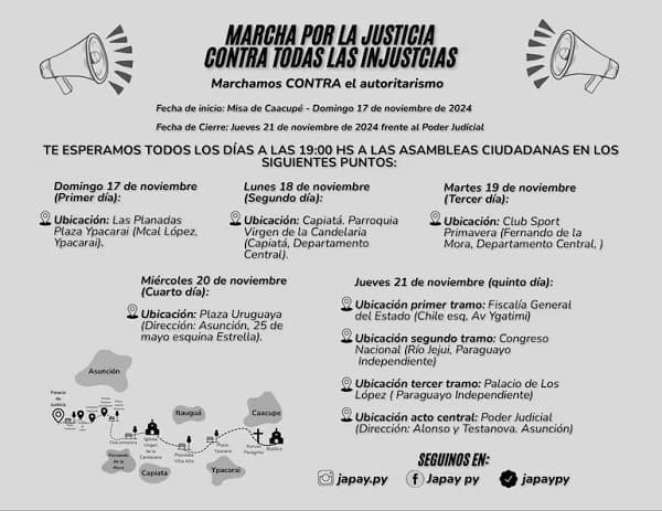 La marcha tendrá una hoja de ruta extensa que culminará el próximo jueves 21 de noviembre en Asunción. Este domingo, los participantes se reunirán en una asamblea ciudadana en la plaza de Ypacaraí a partir de las 19:00. Posteriormente, el recorrido abarcará ciudades clave como Capiatá, Fernando de la Mora y Luque, para finalmente llegar a la capital.