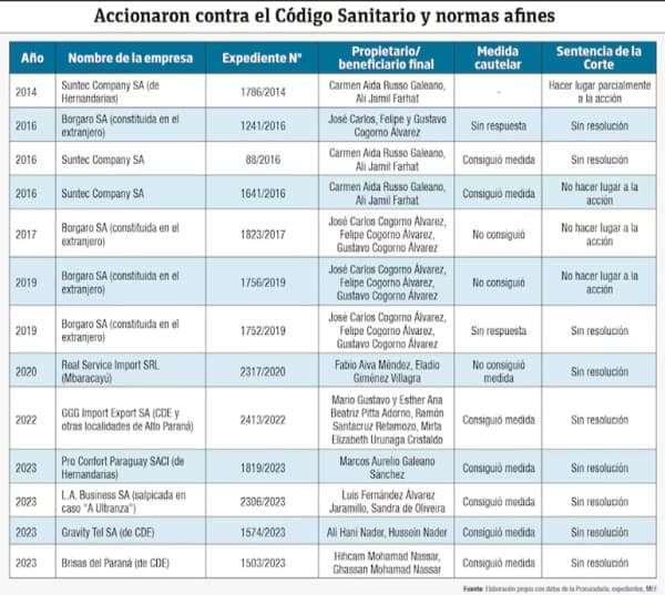 Según una investigación de ABC Color, empresas de dudoso origen logran introducir productos al mercado paraguayo sin cumplir las normativas sanitarias. Esto ocurre mediante medidas cautelares otorgadas por la Corte Suprema de Justicia (CSJ), que lleva casi una década sin resolver varias de estas acciones de inconstitucionalidad contra el Código Sanitario y normas afines.
