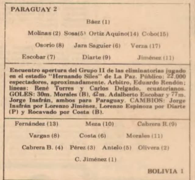 El único triunfo paraguayo en la altura ocurrió el 2 de septiembre de 1973, en el estadio Hernando Siles de La Paz, durante las Eliminatorias para el Mundial de Alemania 1974. En aquella ocasión, el equipo dirigido por el uruguayo Washington Etchamendi remontó el marcador para vencer 2-1. Morales adelantó a Bolivia, pero Adalberto Escobar y Jorge Insfrán revirtieron el resultado, marcando una victoria histórica.