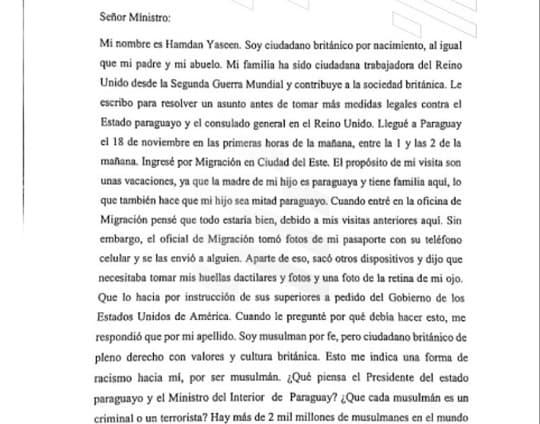 Hamdan Yaseen, ciudadano británico de nacimiento, denunció públicamente haber sido víctima de maltratos y discriminación en la oficina de Migraciones de Ciudad del Este. En una carta dirigida al Ministro del Interior, Enrique Riera, Yaseen afirmó que fue sometido a procedimientos innecesarios y trato discriminatorio al ingresar al país el pasado 18 de noviembre.