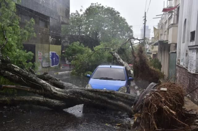 El microcentro de Asunción vivió momentos de tensión este mediodía cuando fuertes vientos derribaron varios árboles, causando daños en vehículos y cables eléctricos. En medio del caos, un automóvil Toyota Vitz color azul se salvó milagrosamente al quedar intacto entre dos árboles caídos, uno delante y otro detrás, un hecho que llamó la atención de los transeúntes.
