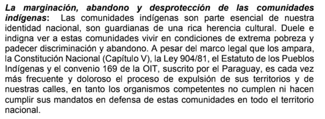 La Iglesia también llama la atención sobre el abandono de los pueblos indígenas, quienes enfrentan despojo de tierras y discriminación. La situación de los pequeños productores rurales también es crítica, debido a la falta de políticas públicas que promuevan una reforma agraria justa y el desarrollo sostenible.