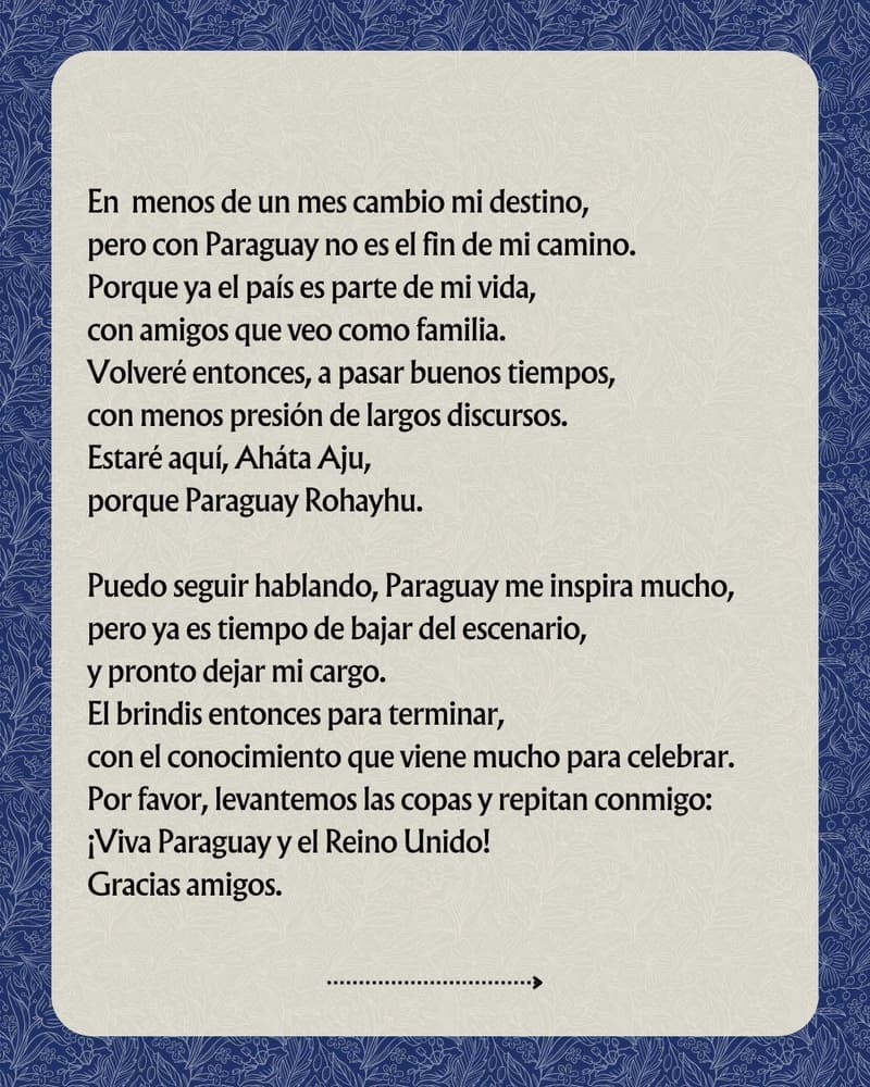 El poema finalizó con un mensaje de unión y celebración: “¡Viva Paraguay y el Reino Unido!”. Este gesto reafirmó el compromiso de ambas naciones con la amistad y la cooperación mutua.