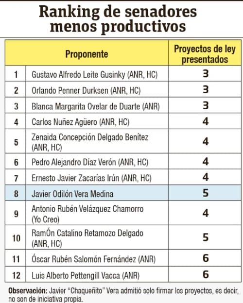 La senadora Zenaida Delgado y el senador Javier Zacarías Irún, ambos cartistas, se encuentran entre los legisladores con menor actividad legislativa, acumulando apenas cuatro proyectos cada uno. Además, Delgado ha sido señalada por el uso de vehículos del Congreso para fines particulares, mientras que Zacarías Irún ha generado controversias por sus propiedades no declaradas y sus declaraciones públicas.