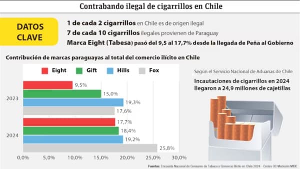 El crecimiento de Eight resulta particularmente notable en el contexto actual. La marca insignia de Tabesa, vinculada al expresidente Horacio Cartes, prácticamente duplicó su presencia en el mercado ilegal chileno durante el último año, alcanzando un 17.7% de participación.