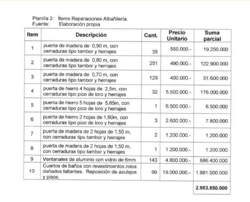 La rehabilitación completa del edificio requeriría una inversión de G. 42.895.095.300, según el informe. Este monto incluye la adecuación de 6.705,9 metros cuadrados de áreas útiles para oficinas, valorada en G. 23.235 millones, además de trabajos de albañilería, reconstrucción estructural y la implementación de sistemas de seguridad y accesibilidad.