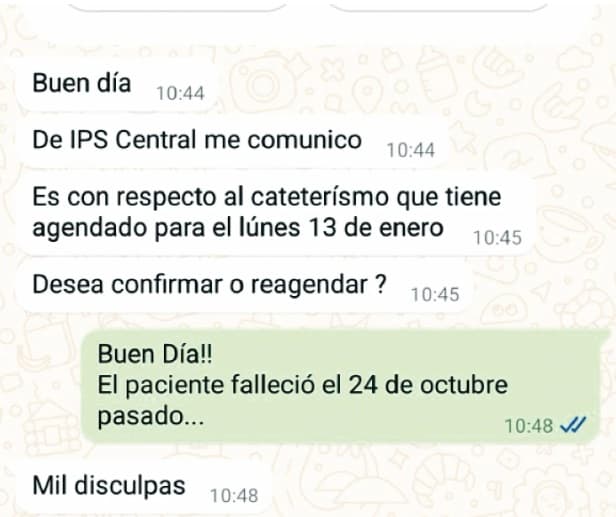 El paciente falleció el 24 de octubre, mientras que el mensaje del IPS, enviado el 13 de enero, invitaba a confirmar o reagendar el turno.