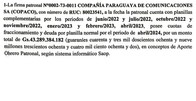 Un aspecto particularmente crítico es la deuda con el Instituto de Previsión Social (IPS), que supera los USD 5.5 millones. A pesar de realizar los descuentos correspondientes en los salarios, COPACO no transfiere estos fondos a la previsional, dejando a los empleados sin acceso a servicios médicos y comprometiendo sus futuras jubilaciones.