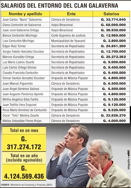 Entre los casos destacados se encuentra Diana Centurión, esposa de Nano Galaverna, quien junto con su hermano Juan José Galaverna cobra casi G. 100 millones mensuales en Itaipú Binacional. A esto se suma una lista de personas del entorno familiar y político que ocupan cargos en instituciones como la Secretaría de Desarrollo para Repatriados y Refugiados Connacionales (Sederrec) y la Orquesta Nacional de Música Popular (Onamp), ambas señaladas como refugios de operadores del clan.