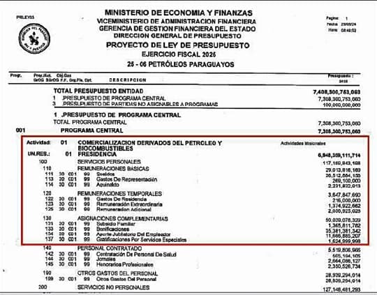 La estatal Petropar ha presentado un presupuesto para 2025 que ha generado debate, debido a que las asignaciones extraordinarias destinadas a bonificaciones para sus funcionarios casi duplican el monto proyectado para salarios. Según el documento presupuestario presentado al Ministerio de Economía y Finanzas (MEF), la cifra destinada a bonificaciones alcanza los G. 35.381.342.000, mientras que los salarios ascienden a G. 26.512.844.156.