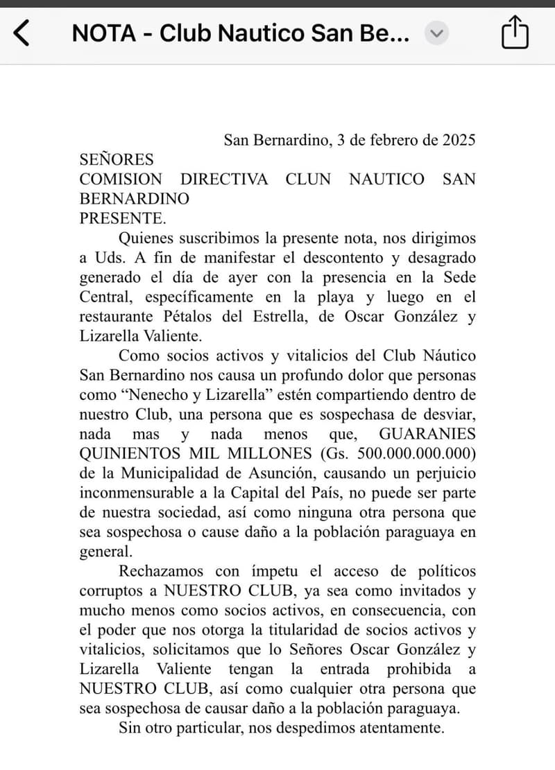 Un incidente protagonizado por el intendente de Asunción, Óscar “Nenecho” Rodríguez (ANR-HC), y la senadora Lizarella Valiente (ANR-HC) generó malestar entre los socios del Club Náutico San Bernardino. La pareja ingresó sin autorización al exclusivo club para celebrar su aniversario de bodas en el restaurante Pétalo de Estrellas, ubicado dentro del predio sobre el lago Ypacaraí.