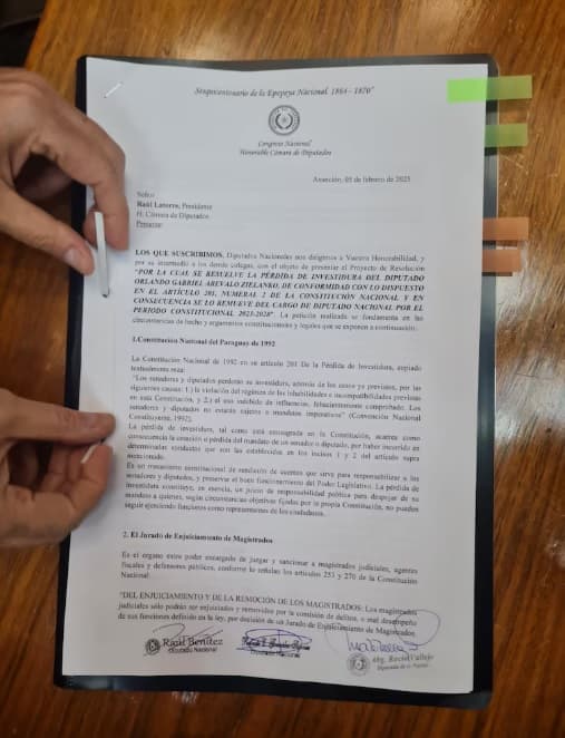 La diputada Rocío Vallejo anunció el inicio de la colecta de firmas para presentar el libelo acusatorio contra Orlando Arévalo, quien enfrenta denuncias de tráfico de influencias. El documento ya cuenta con las primeras adhesiones y se espera que sea presentado el viernes ante la Cámara de Diputados.