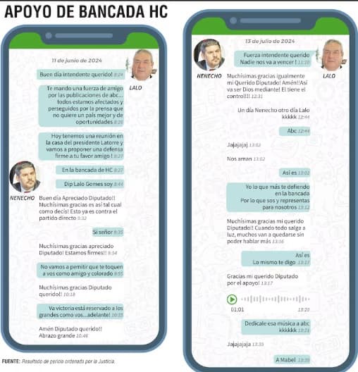 Las conversaciones, fechadas entre junio y julio de 2024, muestran a Gómez ofreciendo una “defensa firme” a Rodríguez dentro de la bancada de Honor Colorado, especialmente ante las publicaciones periodísticas que cuestionaban su administración. “No vamos a permitir que te toquen a vos como amigo y colorado”, escribió el legislador, dejando en claro la existencia de un pacto de protección política por encima de cualquier control institucional.