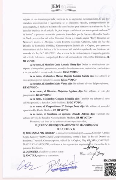 La abogada Alejandra Peralta Merlo, representante legal de Chena, ha sido contundente al vincular esta decisión con las recientes revelaciones: “Los chats filtrados que salpican al JEM dan sentido a esta injusta absolución”. La letrada ha anunciado una ofensiva legal que incluye una acción de inconstitucionalidad y denuncias penales contra los miembros firmantes.