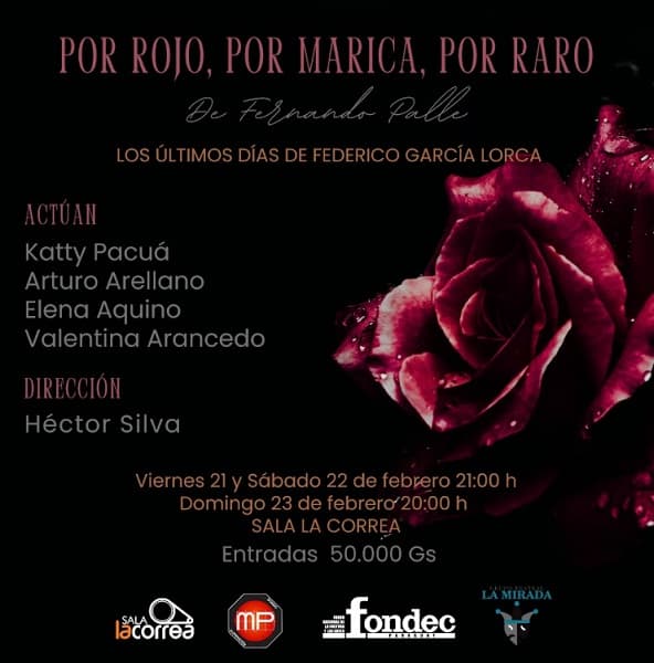 El Grupo Teatral La Mirada estrena su primera obra del 2025, “Por rojo, por marica, por raro”, escrita por el dramaturgo uruguayo Fernando Palle. La puesta en escena revive los últimos días de Federico García Lorca, acompañado por los personajes de sus icónicas obras: Yerma, La Zapatera Prodigiosa y Mariana Pineda. A través de su dramaturgia y poesía, la obra busca rescatar el pensamiento y legado del escritor español.