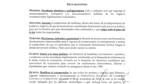 El documento firmado el lunes anterior establece explícitamente el compromiso de “proclamar, defender y garantizar la libertad de prensa como herramienta absolutamente imprescindible para la vigencia de la democracia y la transparencia”. Además, asegura la protección jurídica y física para periodistas que denuncien hechos de interés público.