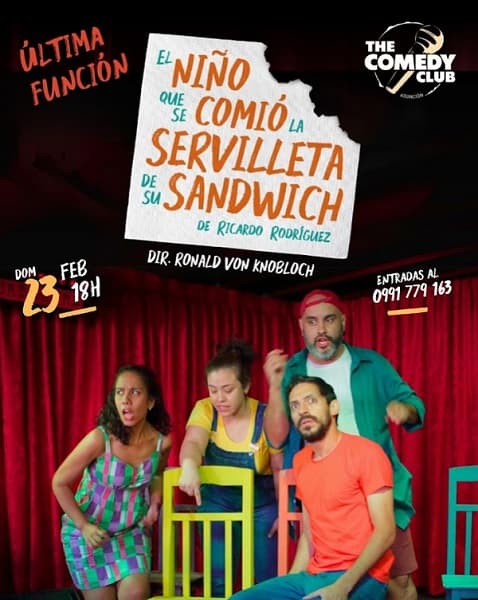 La obra teatral El Niño que se Comió la Servilleta de su Sándwich se despide de los escenarios con su última función el domingo 23 de febrero, a las 18:00, en The Comedy Club Asunción. Dirigida por Ronald von Knobloch y escrita por el dramaturgo mexicano Ricardo Rodríguez, la obra aborda los desafíos de la infancia a través de la historia de Rodrigo, un niño que enfrenta las dificultades de adaptarse a una nueva escuela.