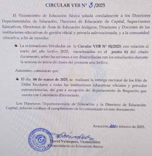 El Ministerio de Educación y Ciencias (MEC) anunció oficialmente que la distribución de kits escolares se realizará el 4 de marzo, situación que genera inquietud en la comunidad educativa debido a que las clases inician el 24 de febrero. Esta decisión fue comunicada mediante la circular N° 3/2025 del Viceministerio de Educación Básica, dirigida a todas las autoridades educativas del país.