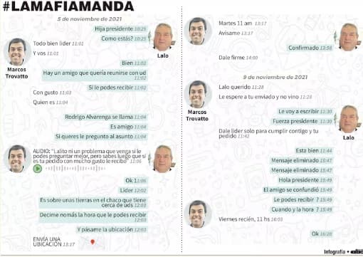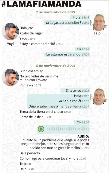 La conversación, fechada el 5 de noviembre de 2021, muestra a Gomes escribiendo a Trovato: “Hay un amigo que quería reunirse con usted. Si le podes recibir”, a lo que el exdirigente deportivo respondió afirmativamente sin cuestionar el motivo del encuentro, señalando en un audio: “…sabes luego que si es tu pedido con mucho gusto le recibo”.