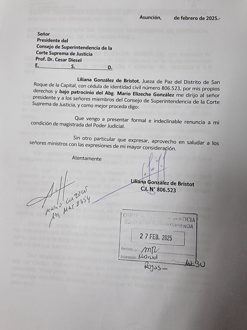 La renuncia fue comunicada a través de una nota presentada por el abogado Mario Elizeche al presidente del Consejo de Superintendencia de la CSJ, César Diesel, donde la magistrada expresó su “formal e indeclinable renuncia” a su condición como integrante del Poder Judicial.