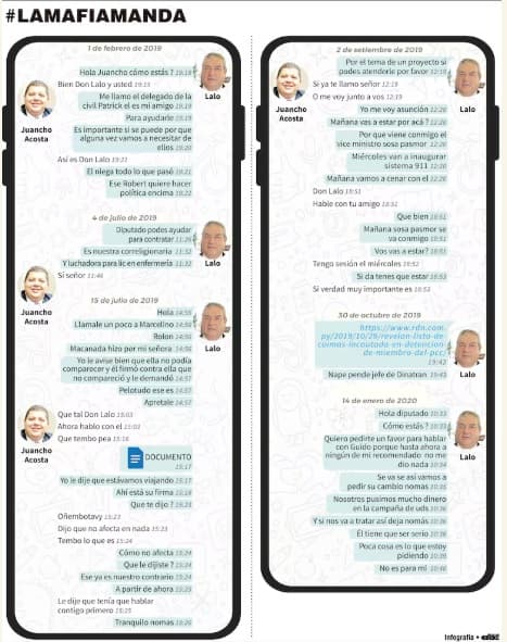 El intercambio de chats muestra cómo Gomes presionaba a Acosta con frases como: “Nosotros pusimos mucho dinero en la campaña de ustedes. Y si nos va a tratar así, dejá nomás”. También solicitó intervención en nombramientos, sugiriendo incluso el cambio de un funcionario que no accedió a sus pedidos. La ausencia de respuesta de Acosta en algunos mensajes refuerza la percepción de un sistema de favores en la estructura política del país.