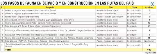 Según el Ministerio de Obras Públicas y Comunicaciones (MOPC), existen 77 pasos de fauna en funcionamiento y 26 en construcción, siendo la ruta PY09 (Transchaco) la que más estructuras de este tipo posee, con un total de 41. Su ubicación es determinada a partir de estudios de impacto ambiental, la presencia de formaciones boscosas y registros de avistamientos de fauna silvestre en las zonas intervenidas.