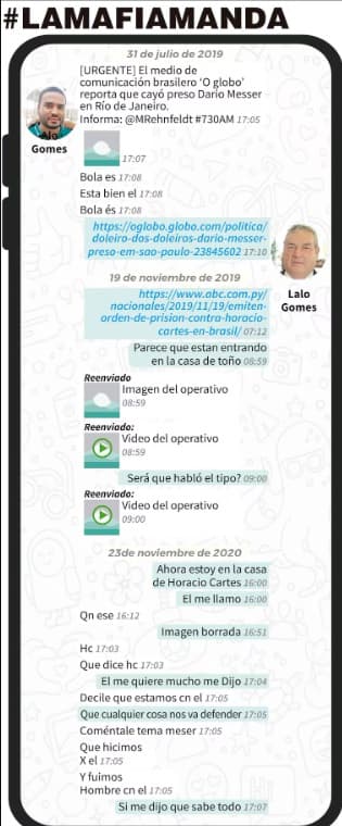 Los chats filtrados entre el fallecido diputado cartista Eulalio “Lalo” Gomes y su hijo Alexandre Rodrigues Gomes, actualmente imputado por presunto narcotráfico y lavado de dinero, revelan un aparente “favor” realizado por ambos en el caso del condenado brasileño Darío Messer. Las conversaciones muestran cómo el 23 de noviembre de 2020, durante una visita del legislador colorado a la residencia del expresidente Horacio Cartes, Alexandre solicitó a su padre: “Coméntale tema Messer. Qué hicimos por él. Y fuimos hombre con él” .
