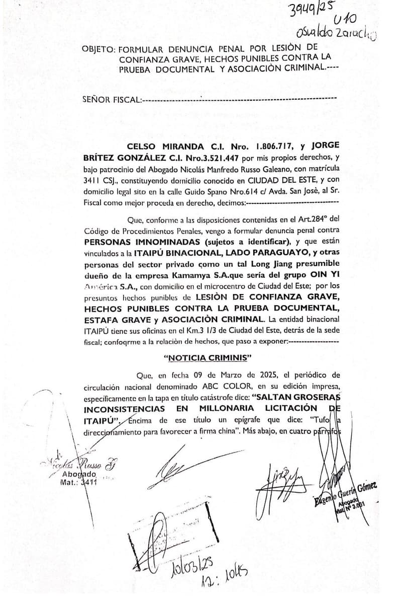 El exdiputado Jorge Brítez y el exconcejal municipal de Ciudad del Este, Celso Miranda, formalizaron una denuncia penal contra el director de Itaipú, Justo Zacarías Irún. Los denunciantes señalan presuntas irregularidades en la licitación de pupitres escolares, acusando al funcionario de estafa, lesión de confianza, asociación criminal y sobrefacturación en el proceso de adquisición de mobiliario educativo.