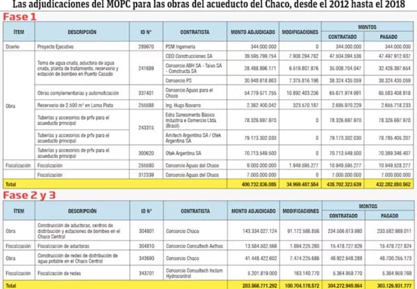 El proyecto del acueducto del Chaco atravesó tres administraciones gubernamentales: comenzó durante el gobierno de Federico Franco, continuó con Horacio Cartes y finalizó con Mario Abdo Benítez. En este periodo, el MOPC adjudicó 15 contratos para la construcción, fiscalización y diseño de la obra, por un valor total que superó los 100 millones de dólares.