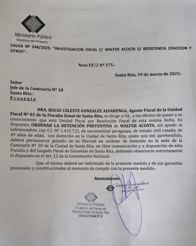 El Ministerio Público dictó una orden de captura contra Walter Acosta, abogado de 49 años, acusado de agredir a una fiscalizadora del Instituto Nacional de Tecnología, Normalización y Metrología (INTN) en Tavapy, Alto Paraná.