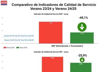 La Administración Nacional de Electricidad (ANDE) registró una importante mejora en la calidad del servicio eléctrico durante el verano 2024-2025, según informó el presidente de la institución, Ing. Félix Sosa. Los indicadores técnicos muestran que la Duración Equivalente de Potencia (DEP) disminuyó en un 49,1%, mientras que la Frecuencia Equivalente de Potencia (FEP) se redujo en un 25,9% en comparación con el verano anterior. Esta mejora resulta particularmente significativa considerando que el período estival 2023-2024 fue uno de los más críticos de los últimos años en cuanto a interrupciones del suministro eléctrico.